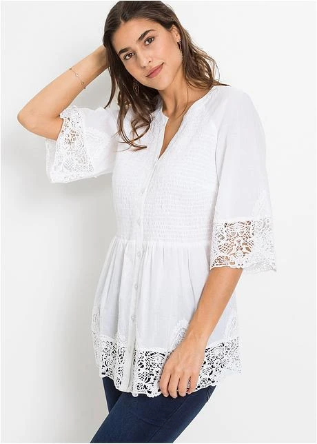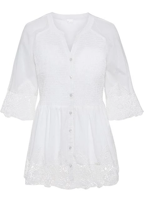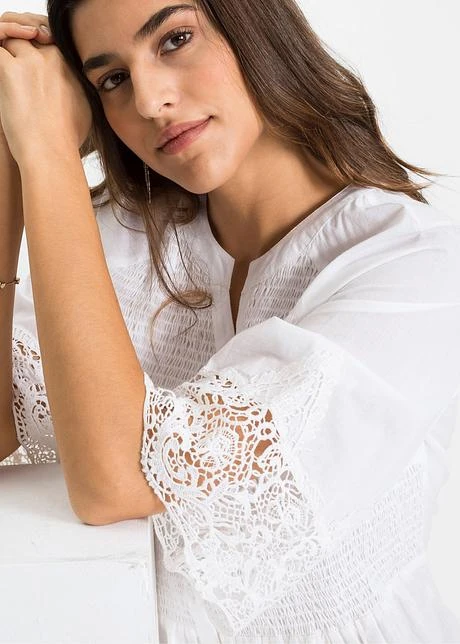 Blouse à encolure ronde avec fente. Patte de boutonnage avec 7 boutons devant. Le buste smocké, la large dentelle aux manches raglan 3/4 et à la base lui confèrent un look romantique à souhait. Long. env. 76 cm.