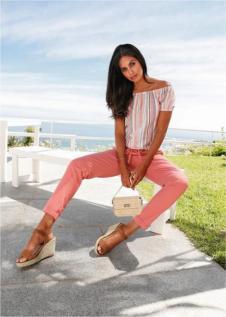Adorable blouse de la marque BODYFLIRT, forme droite, encolure Carmen, manches courtes élastiquées, long. env. 62 cm.