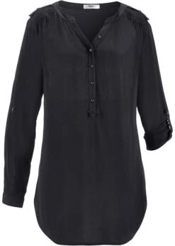 Blouse-tunique flatteuse à manches longues, base arrondie et patte de boutonnage.