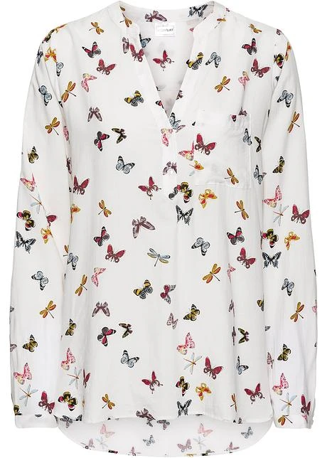Chemisier féminin avec décolleté en V et joli imprimé papillon. Encolure en V avec patte de boutonnage. Petites fentes latérales. Légèrement plus long au dos. Base légèrement arrondie. Coupe droite. Long. env. 70 cm, lavage machine.
