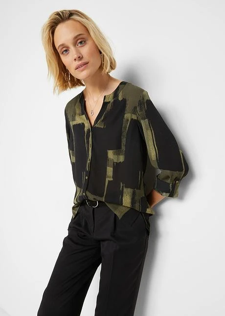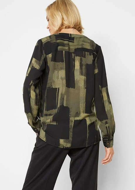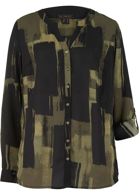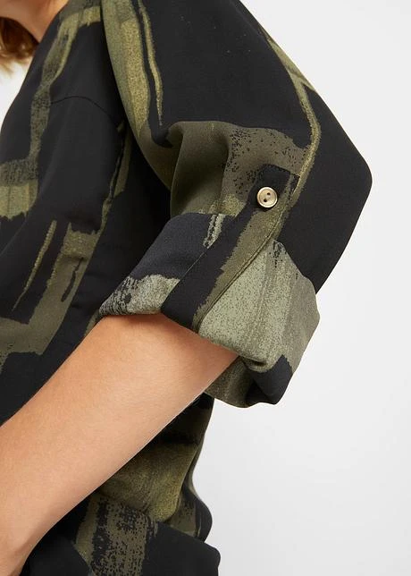 Imprimé mode, petit col montant et patte de boutonnage devant, manches longues à retrousser, petites fentes latérales, long. d’env. 69 cm à 78 cm, lavage machine.