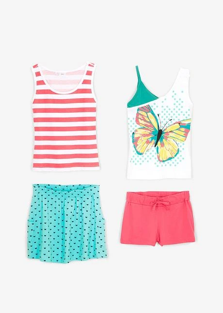 Toutes les pièces peuvent s’associer ! L’ensemble comprend un top rayé et un top orné d’un motif, une jupe imprimée à taille élastique et un short uni à finition élastique.