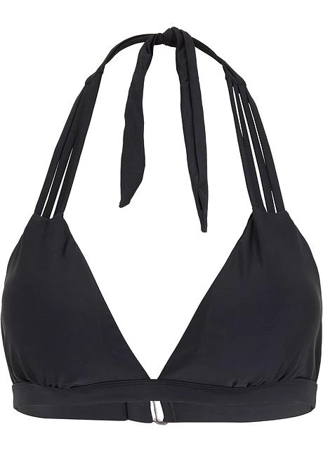 Haut de bikini triangle à bretelles aux finitions originales. À nouer dans la nuque. Fermoir crochet avec trois attaches dans le dos. Coques souples amovibles avec doublure poitrine.