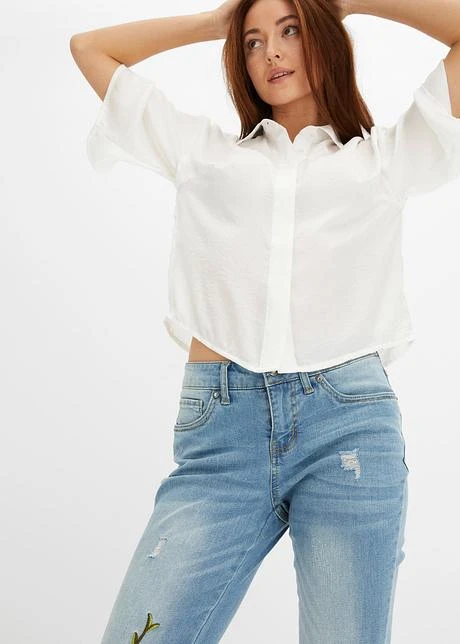 Jean skinny mode de la marque Bodyflirt avec broderie détaillée et bordures à cru à la base. Long. entrejambe env. 70 cm.