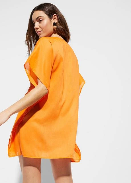 Tunique de plage transparente en matiĂšre tissĂ©e aĂ©rienne. DĂ©colletĂ© plongeant en V. Ălastique coulissĂ© sous la poitrine. Coutures latĂ©rales surpiquĂ©es. Long. env. 59 cm.
