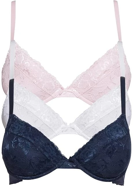 Doté d’armatures et de bonnets rembourrés préformés, le soutien-gorge push-up maintient correctement la poitrine. Pratique et confortable, il dispose d’une doublure en coton, de coussinets amovibles et de bretelles réglables. Tendance et féminins, ses bonnets sont joliment rehaussés de dentelle. Se glissant sous un pull, un chemisier ou un t-shirt, il se porte quotidiennement. Il s’enfile facilement grâce à sa fermeture agrafes au dos.Pratique, le soutien-gorge push-up est disponible par lot de trois.