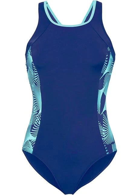 Avec dos nageur. Doublure poitrine et bande élastique sous poitrine. Empiècements imprimés sur les côtés.