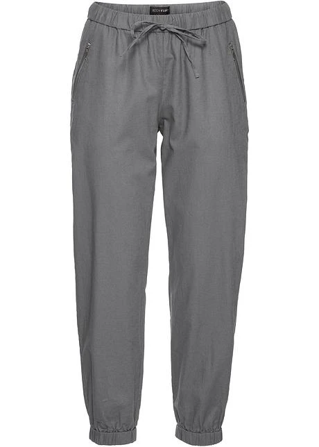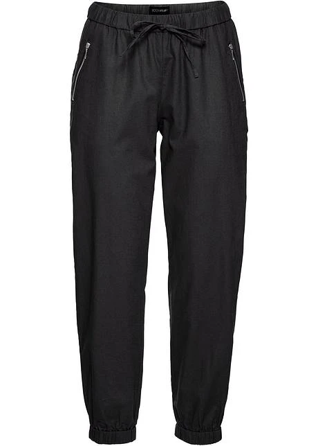 Pantalon lin 7/8 léger et décontracté avec finition élastique en bas de jambes, élastique et cordon à nouer à la taille. Une poche de chaque côté fermée par un zip. Long. entrejambe env. 65,5 cm, lavage machine.