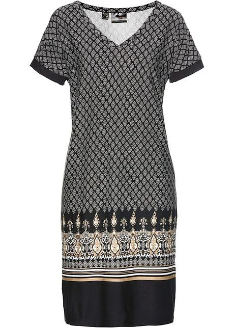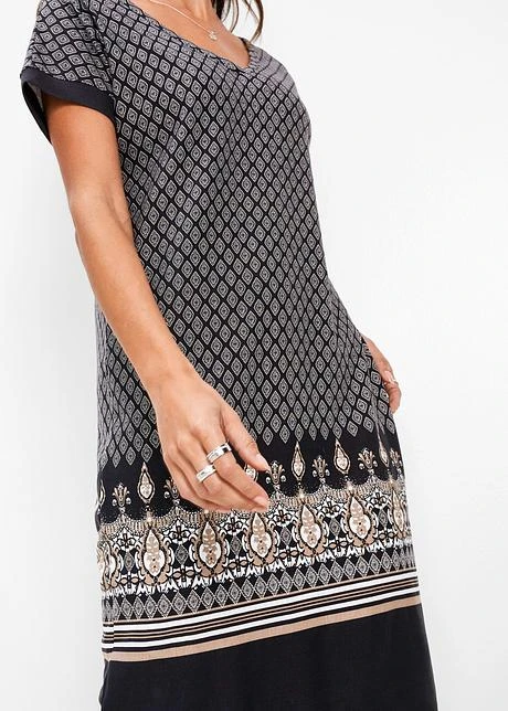 Robe-tunique à imprimé graphique. Légèrement cintrée. Décolleté en V et coutures d’épaules basses. Long. env. 98 cm.
