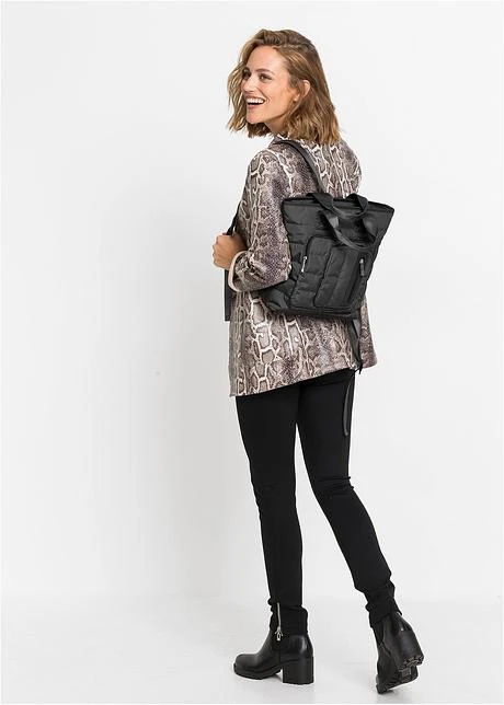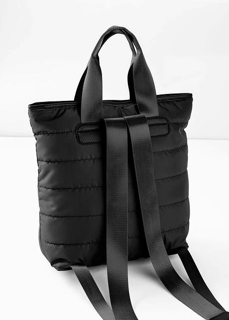 Sac à main et sac à dos 2 en 1 avec anses rigides. Matière matelassée sur l’extérieur, deux compartiments extérieurs et un compartiment principal zippés. Intérieur doublé avec deux poches ouvertes et un compartiment zippé. Bandoulière réglable en longueur et deux anses.