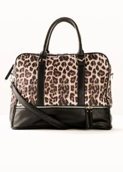 Sac shopper style léopard avec bandoulière réglable en longueur et fond renforcé contrastant. Une poche zippée et deux poches ouvertes à l’intérieur. Compartiment principal et poche extérieure fermés au moyen d’un zip fantaisie. Intérieur doublé.
