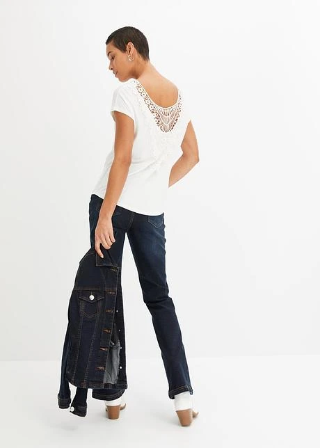 Ce T-shirt de la marque BODYFLIRT doté d’une partie dos originale est une pièce mode qui attire le regard. L’empiècement raffiné en dentelle transparente laisse entrevoir la peau et donne au T-shirt son look attractif. Il est complété d’une encolure bateau et de manches courtes. Ce T-shirt se porte avec un short en jean et des sandales dans un style décontracté pour les loisirs.