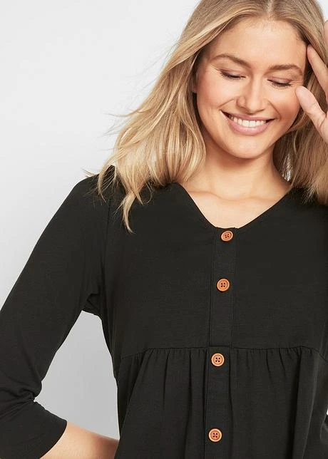 Ce T-shirt est adapté pour chaque mois de grossesse et, grâce à ses boutons, il s’ouvre aisément pour faciliter l’allaitement après la naissance. T-shirt de grossesse avec fonction allaitement style babydoll avec manches 3/4. Matière coton agréablement douce et extensible.