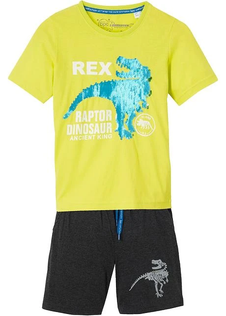 Ensemble cool comprenant un T-shirt et un bermuda en jersey. Le motif dinosaure en paillettes réversibles sur le devant du T-shirt est LA touche tendance. Bermuda doté d’un cordon de serrage pratique pour ajuster l’ampleur.