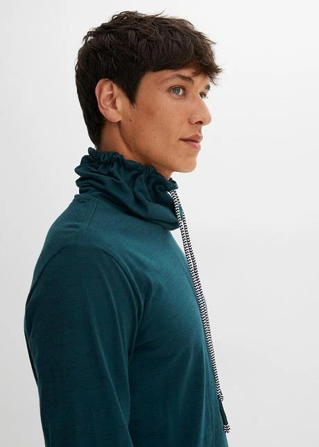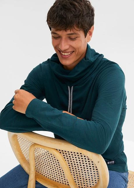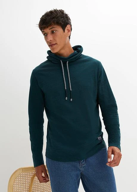 Grand col à porter en forme châle ou col roulé, lien à nouer, aspect chiné cool, forme regular fit confortable, modèle à associer à un pantalon cargo ou un jean.