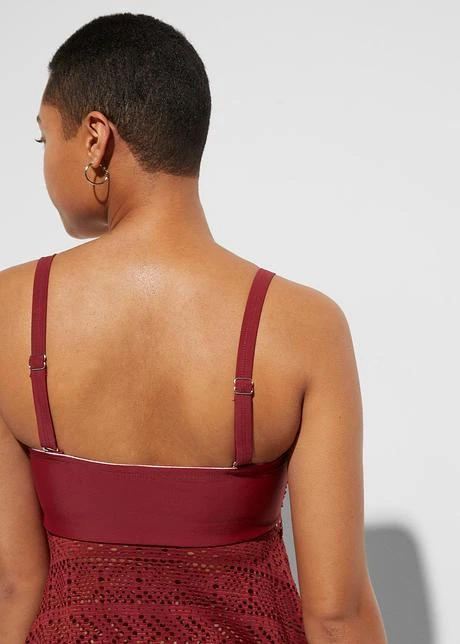 Coupe légèrement trapèze. Avec bretelles réglables. Doublure poitrine et bande élastique intégrale sous poitrine. Coques souples intégrées.
