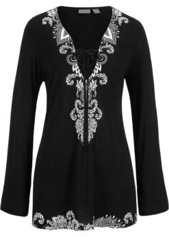 Tunique de plage élégante à décolleté en V avec cordon à nouer. Manches longues. Imprimé placé.
