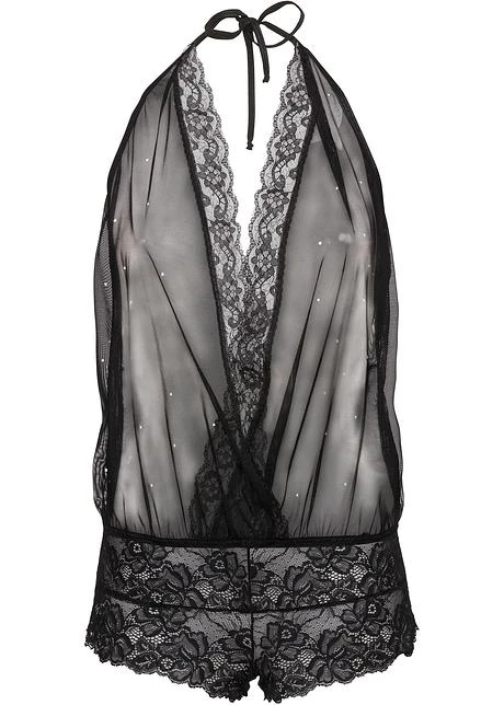 Séduction coquine ! Ce body ouvert élégant nous séduit avec ses nombreux petits détails. La dentelle délicate souligne votre décolleté pour le mettre parfaitement en valeur. La matière douce et transparente épouse agréablement les courbes et vous donne une allure sensuelle à souhait. Des petites pierres brillantes apportent une touche décorative. Body également proposé en grandes tailles.